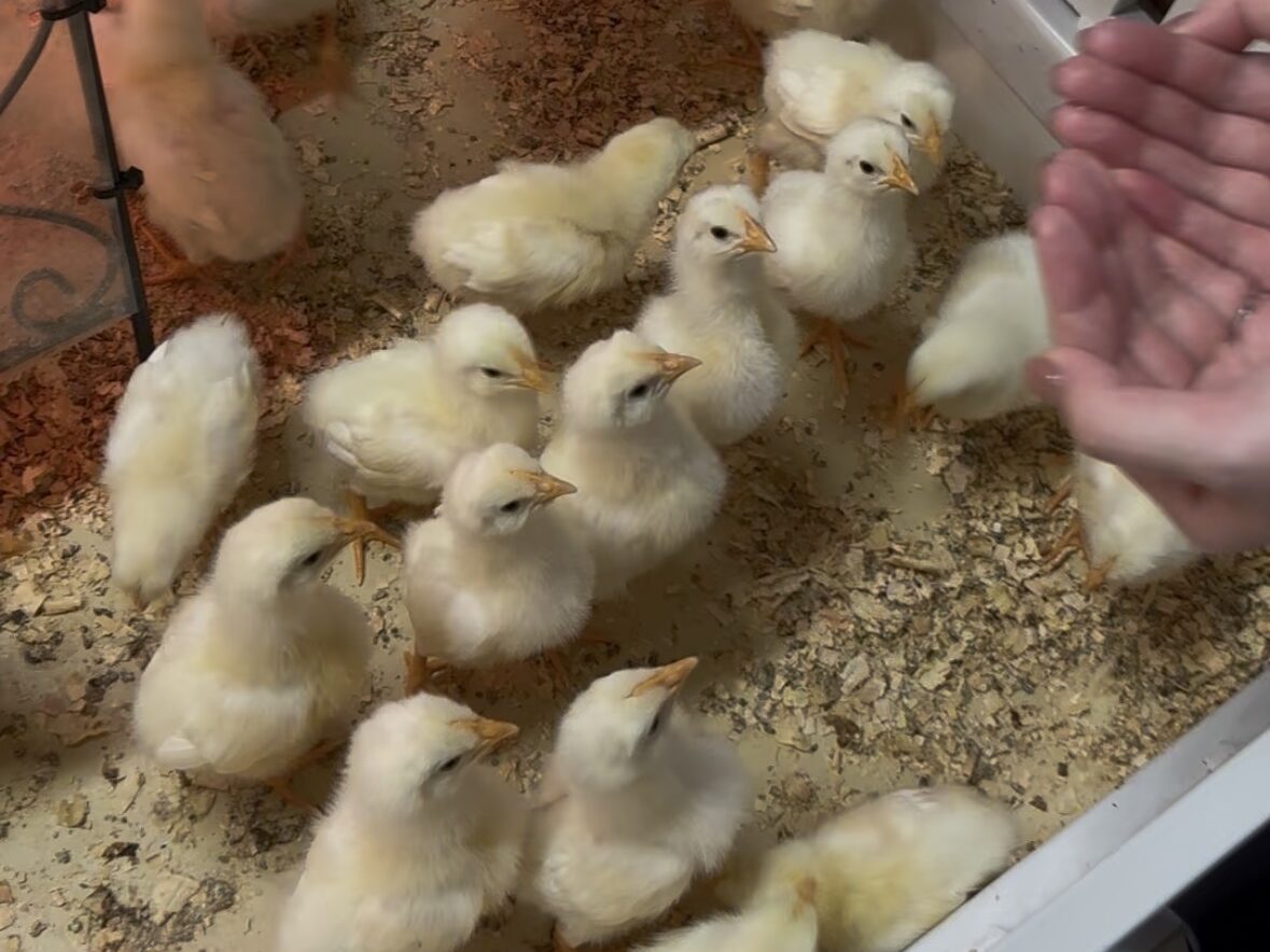 片手にごはんを置いて持っていくと遠くから大量のひよこがこっちに!